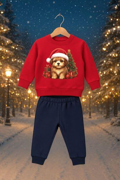 Красив детски комплект от 2 части – блуза с дълъг ръкав в червено с картинка на кученце и панталон.