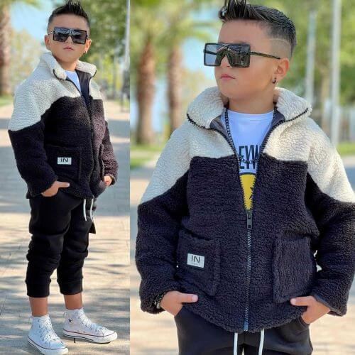 Детски комплект за момче. Комплектът се състои от три части. Дебело горнище, тънка блуза с дълъг ръкав и голяма картинка на предната страна и дебело долнище с един страничен джоб.