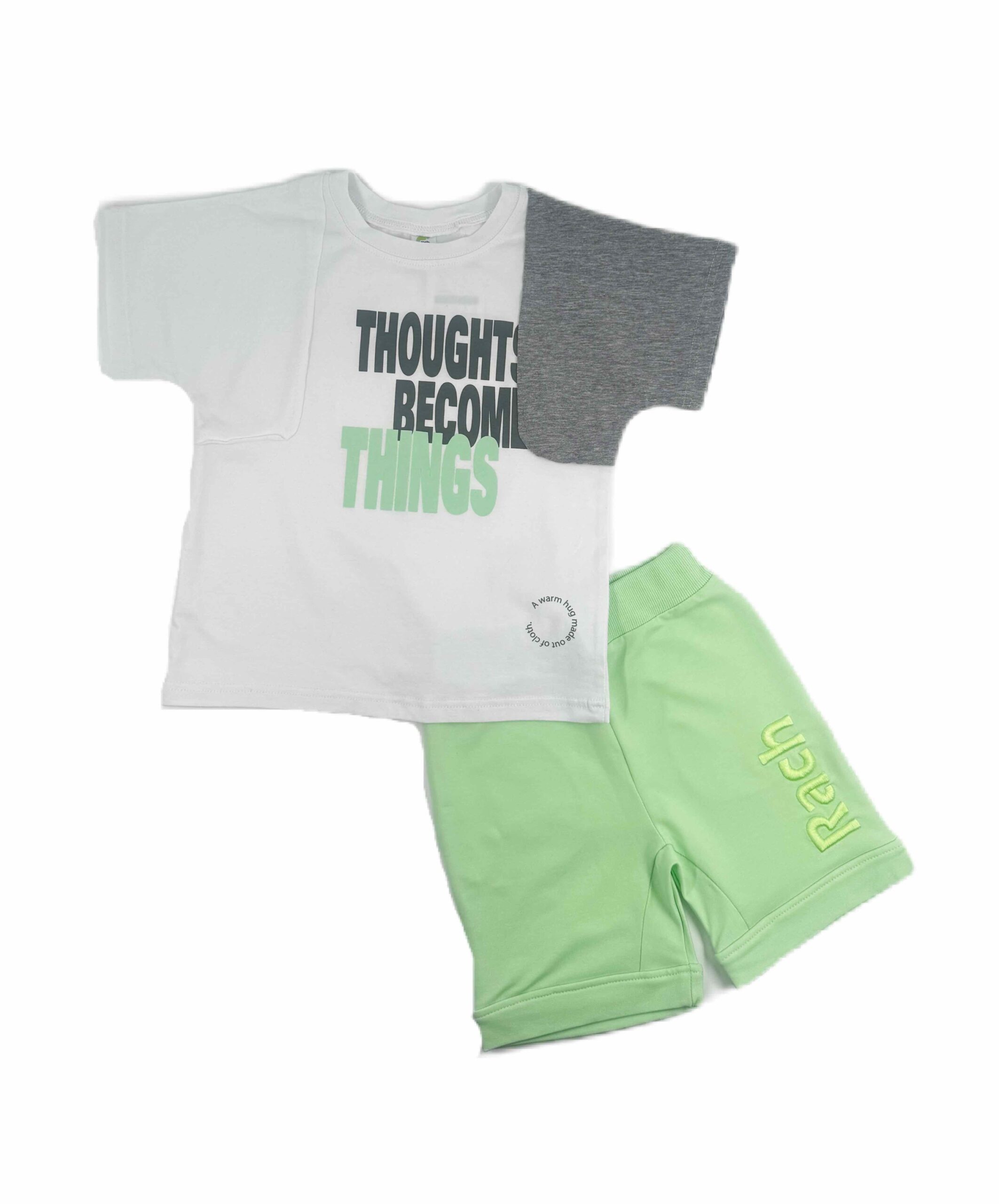Комплект за момче с къси панталонки и тениска. Блузка с модерна кройка и панталонче с две джобчета. Изработени са от тънка памучна материя.