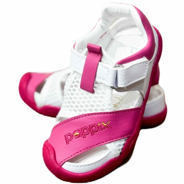 Сиви бебешки ортопедични сандали на PAPPIX. Моделът е с анатомична стелка, затворени пръсти. Сандалите са с една каишка с велкро лепенка за по-лесно обуване и събуване.