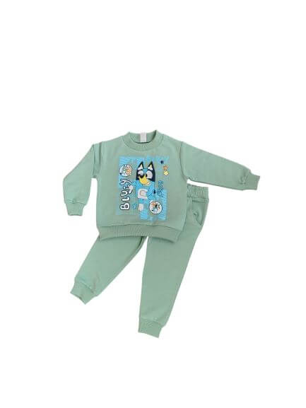 Спортен комплект за момче Bluey * Светли. Комплектът е леко ватиран и се състои от две части. Блуза с дълъг ръкав и картинка на Блуи. И долнище с ластични маншети на крачолите. Комплектът е удобен и практичен.