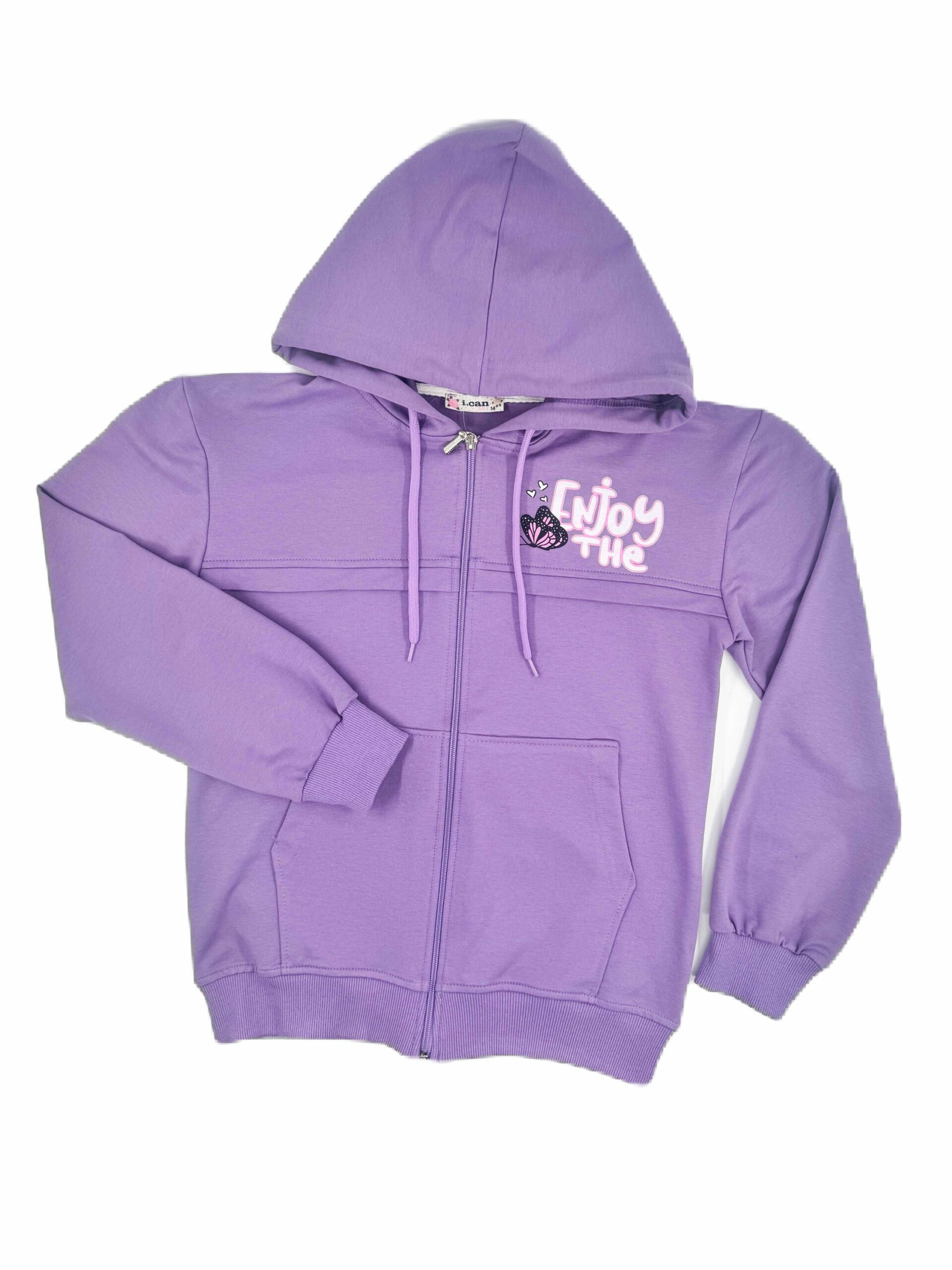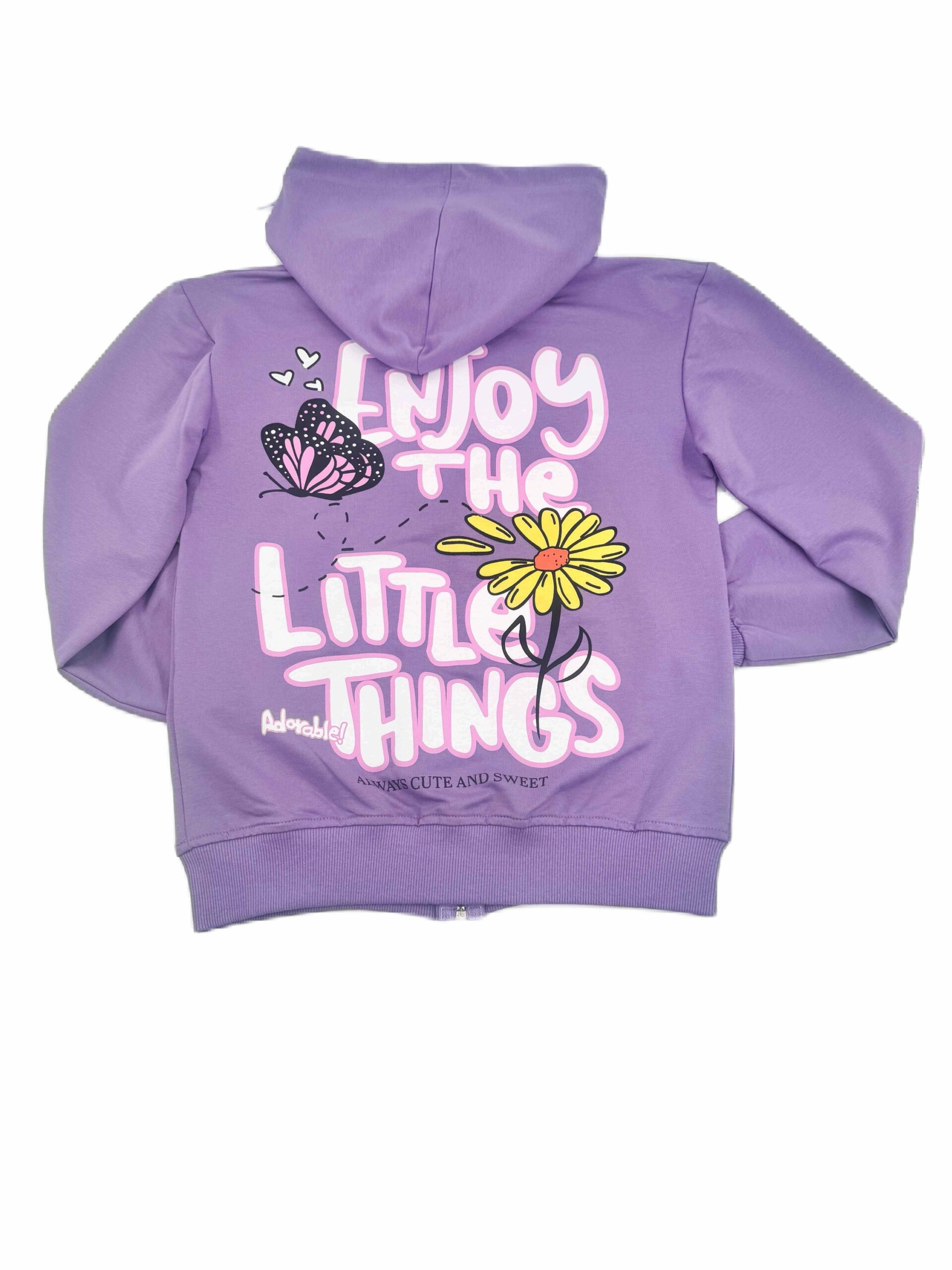 Суитшърт за момиче с цип и качулка, и два функционални джоба. Изработен е от мека памучна материя.