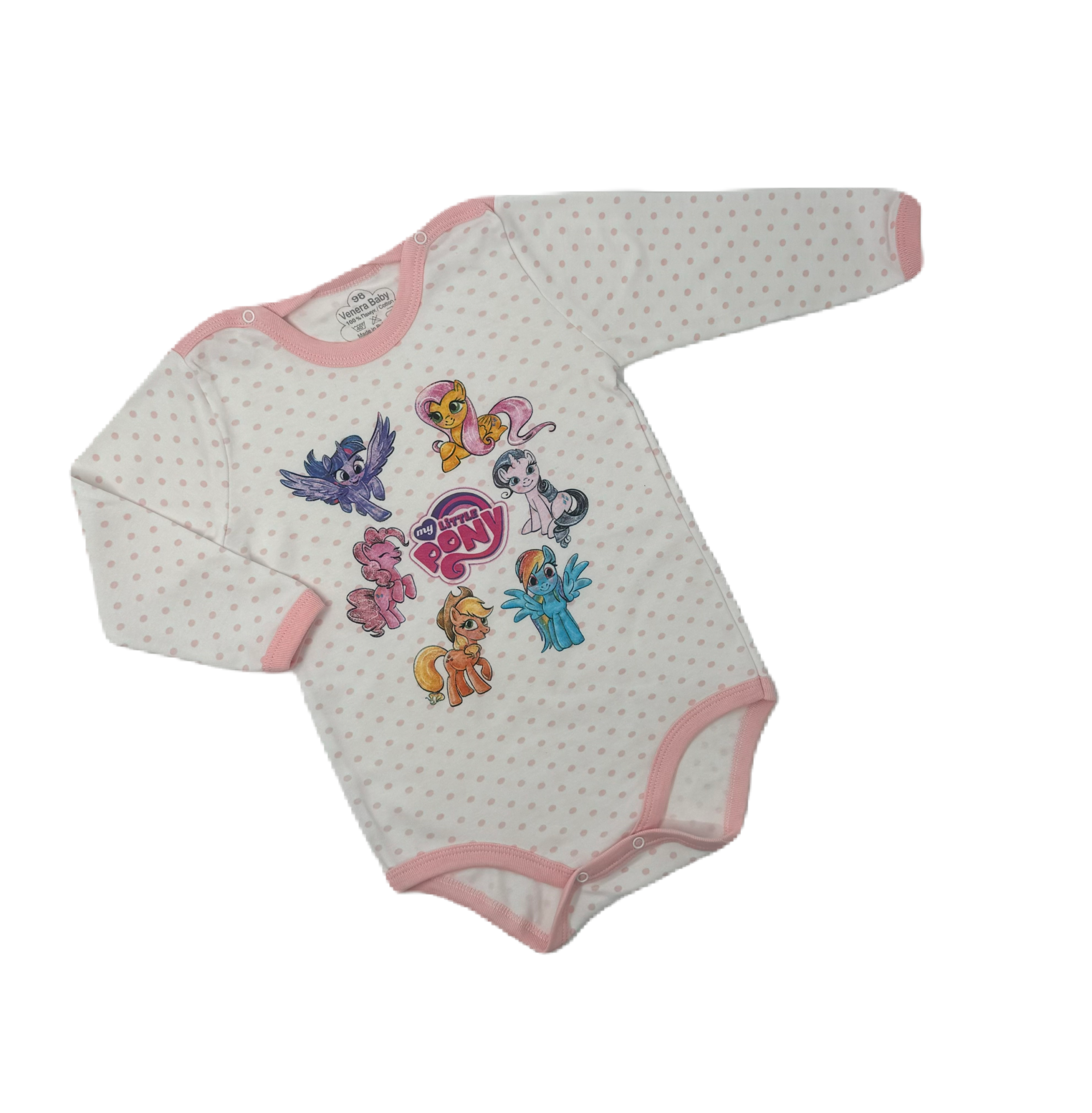 Боди с дълъг ръкав, изработено от интерлог. С детски картинки и точки.
