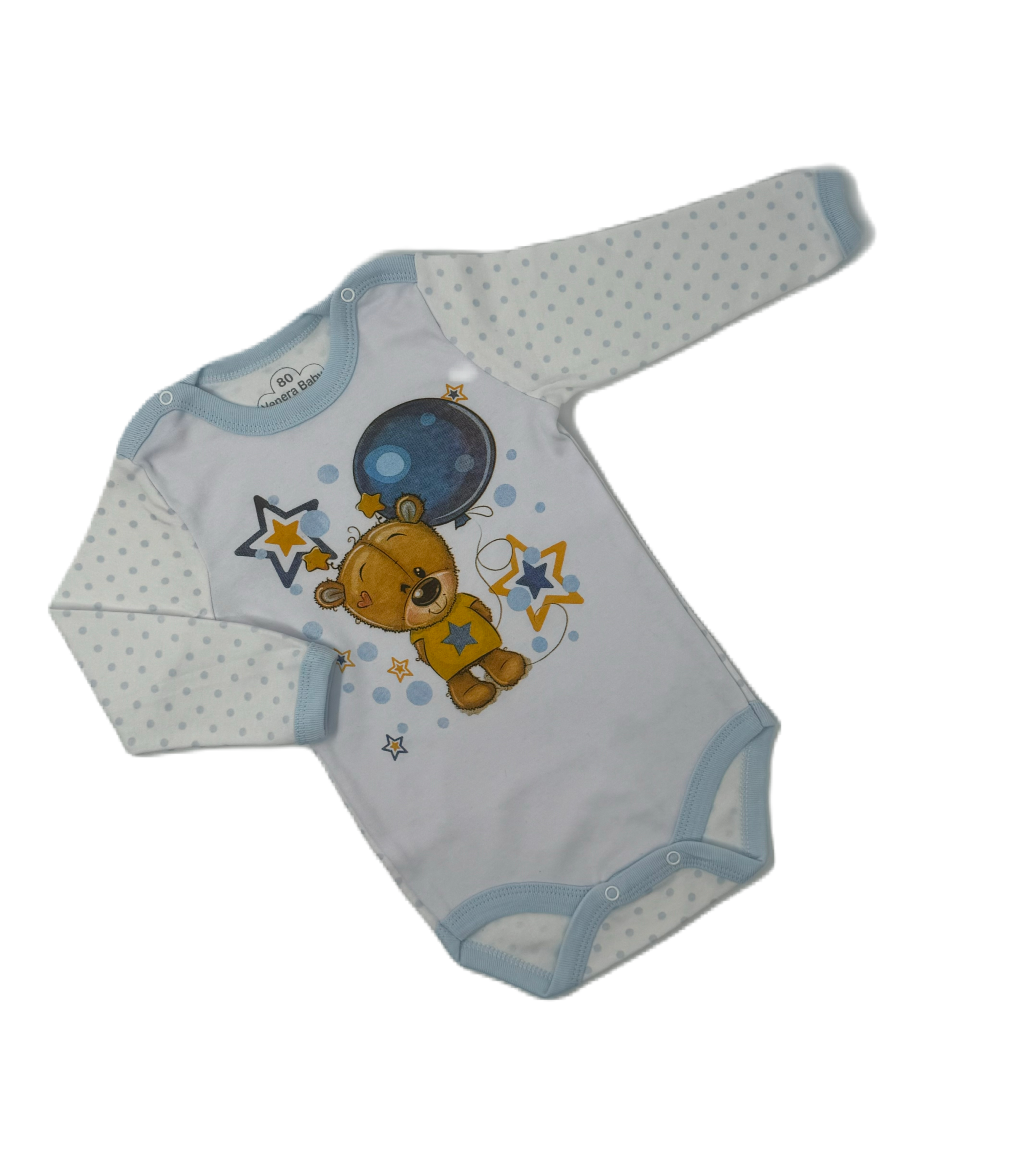 Боди с дълъг ръкав, изработено от интерлог. С детски картинки и точки.