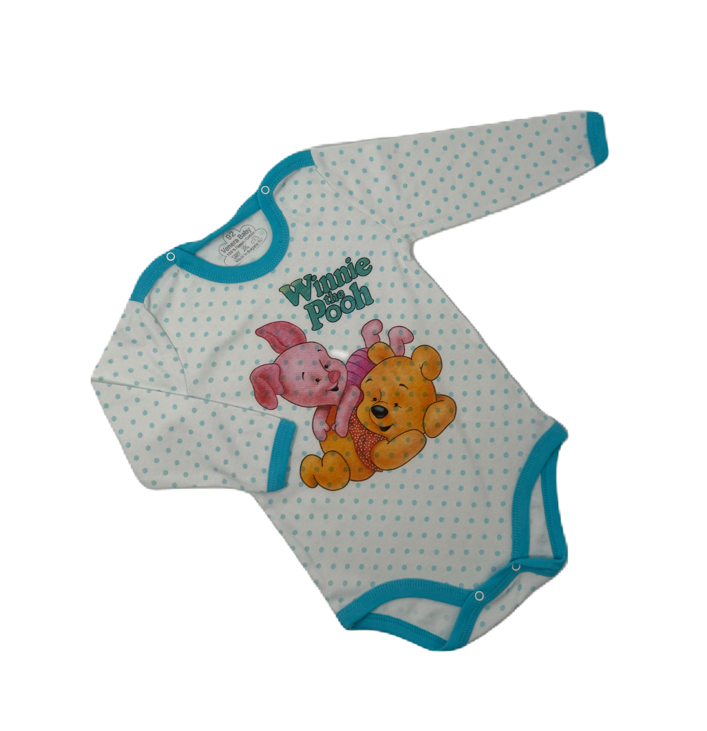 Боди с дълъг ръкав, изработено от интерлог. С детски картинки и точки.